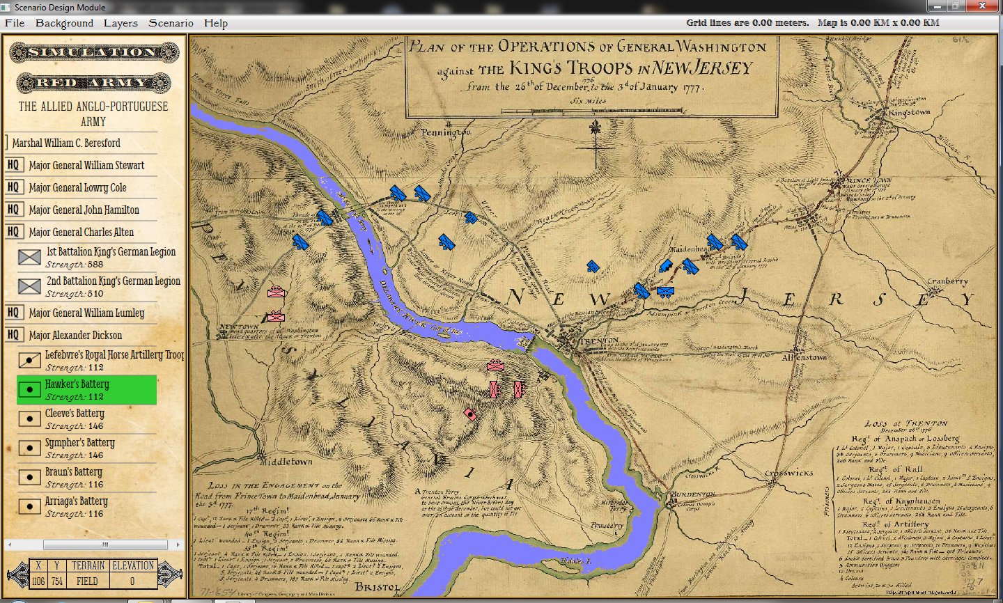 Screen capture of a scenario using a map of Trenton and General Washington’s Continental Army. Click to enlarge.